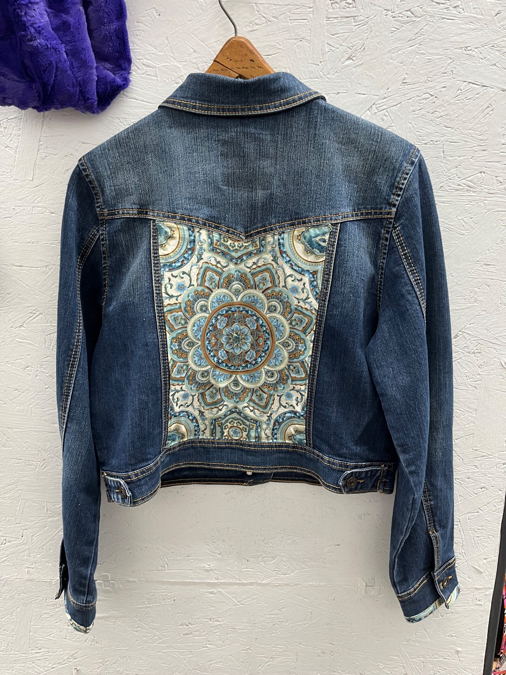 Quilting cotton added to back panel, front yoke, and sleeve/jacket lower band. Just the jacket to wear out on the town or just becauseā¦.wardrobe staple for sure.
