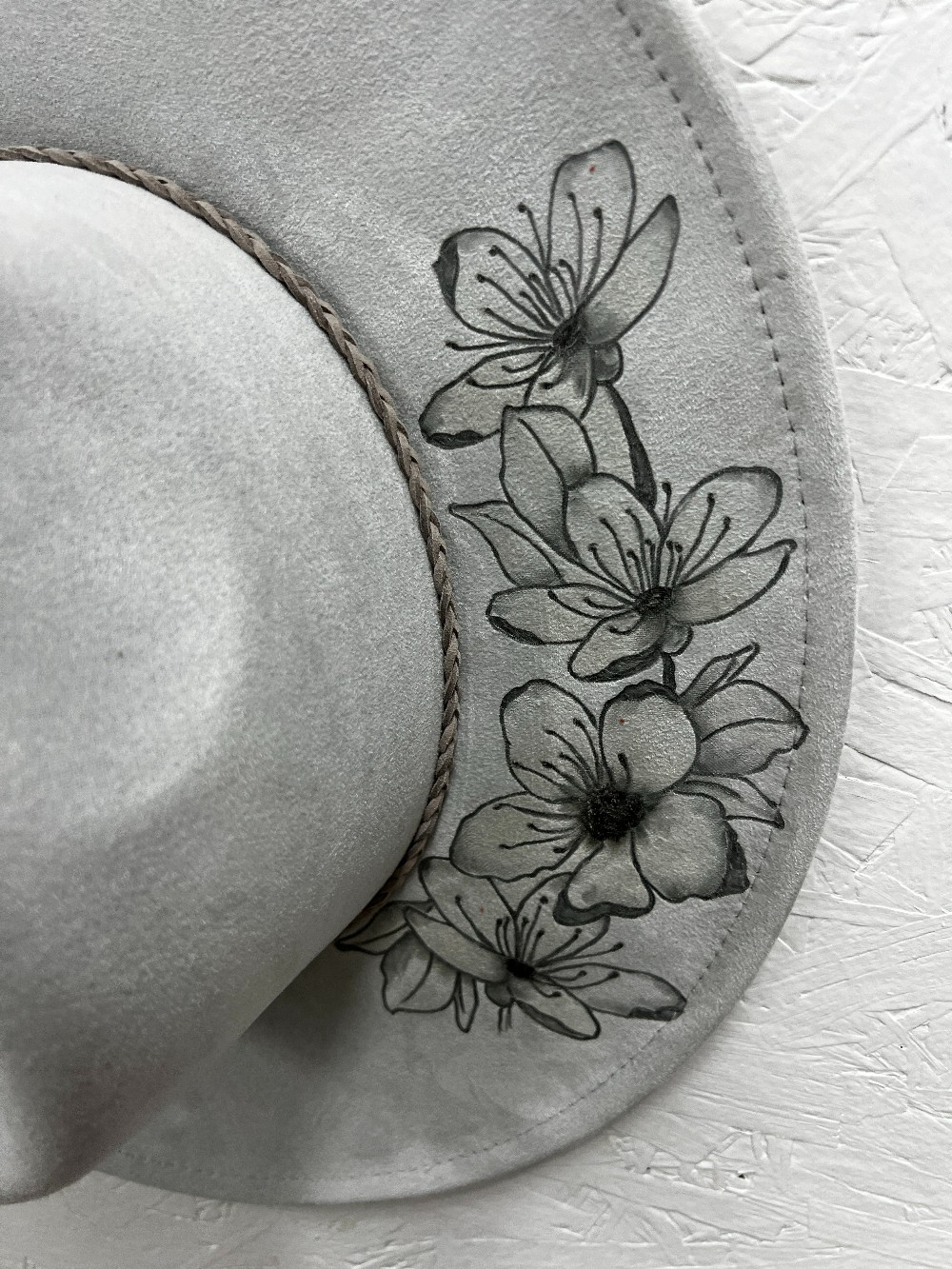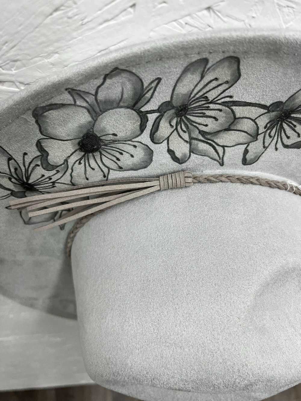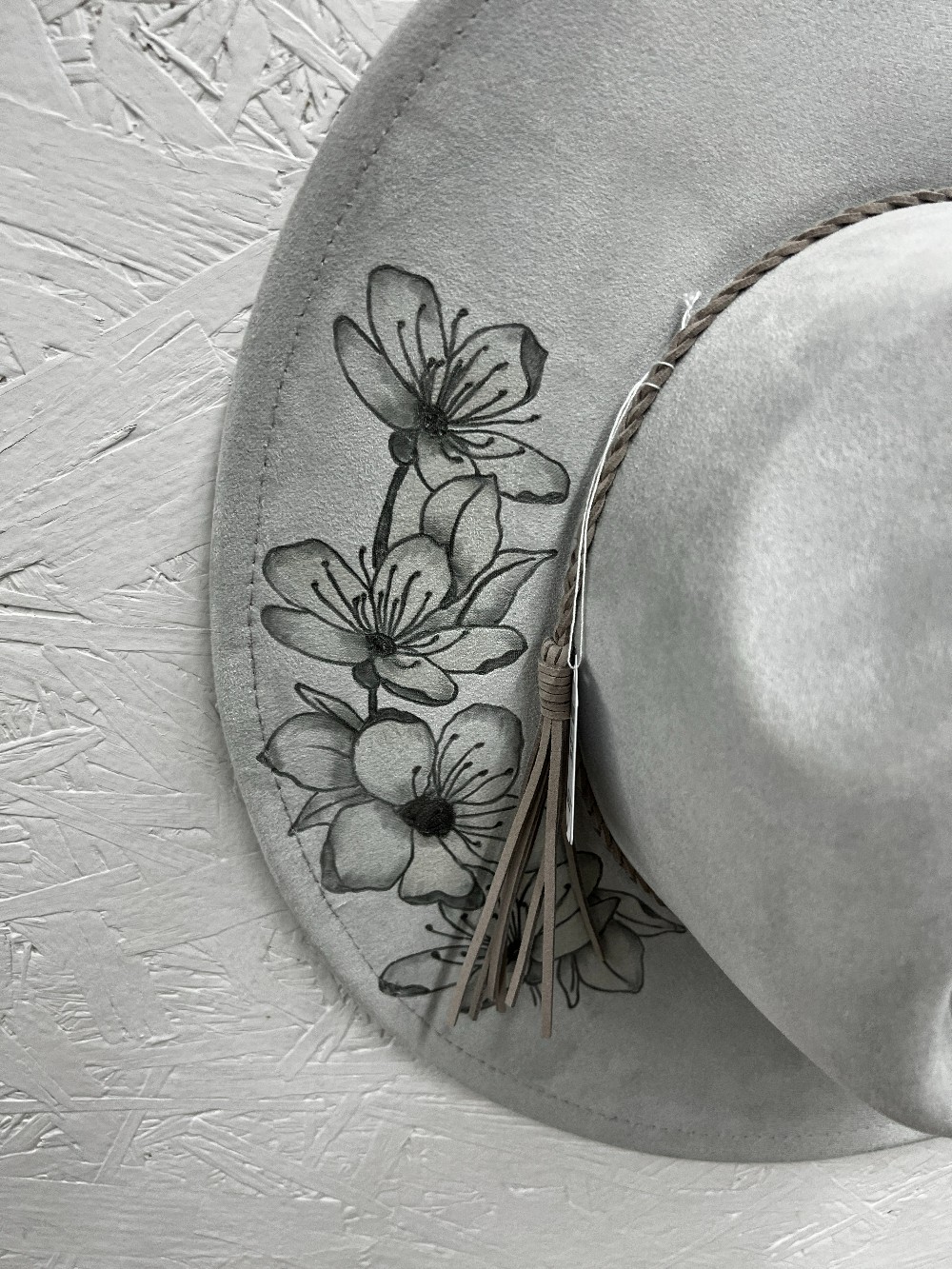 Magnolia Design Fedora style hat. - This Hand Burned Adult Lt. Gray color, wide brim, vegan suede hat has a beautiful hand burned Magnolia design.. It has a matching Lt. Gray band with tassel. This Hat has an overall size of 15-inch. The wide brim is 3.8 inches and the hat height is 4.7 inches. It is adjustable in size and start as a 7 3/8 and can be tightened with an adjustable pull hidden ribbon inside to a 6 3/4. Because of various sanitary concerns, hats are NOT returnable or exchangeable. ALL SALES FINAL