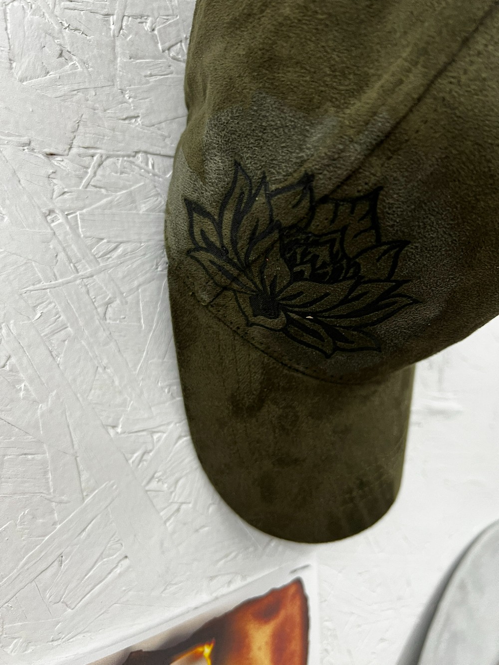 Meet your new go-to cap- plush faux suede on a classic baseball silhouette. the soft, velvety finish elevates jeans-and -tee days and adds a polished touch to athleisure looks. Once-size with an adjustable back closure for a comfy, secure fit. Brim size L 6.5 x W 3 in. It has a cute Olive Green hand burned Lotus flower design and is pony tail friendly. Because of various sanitary concerns, hats are NOT returnable or exchangeable. ALL SALES FINAL