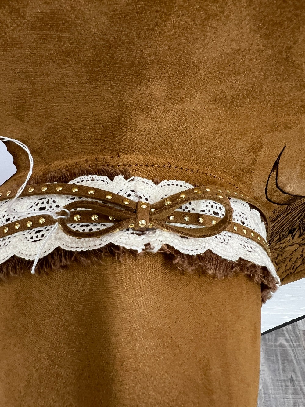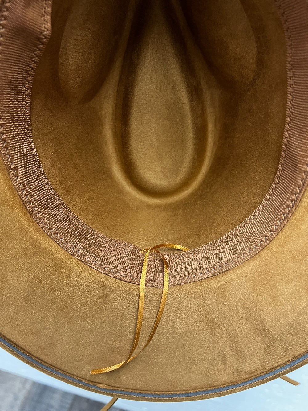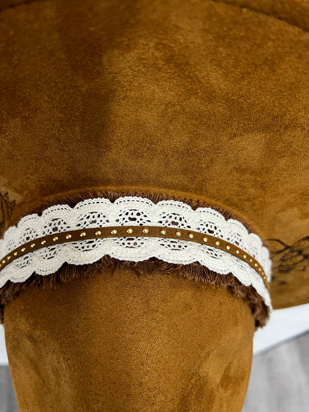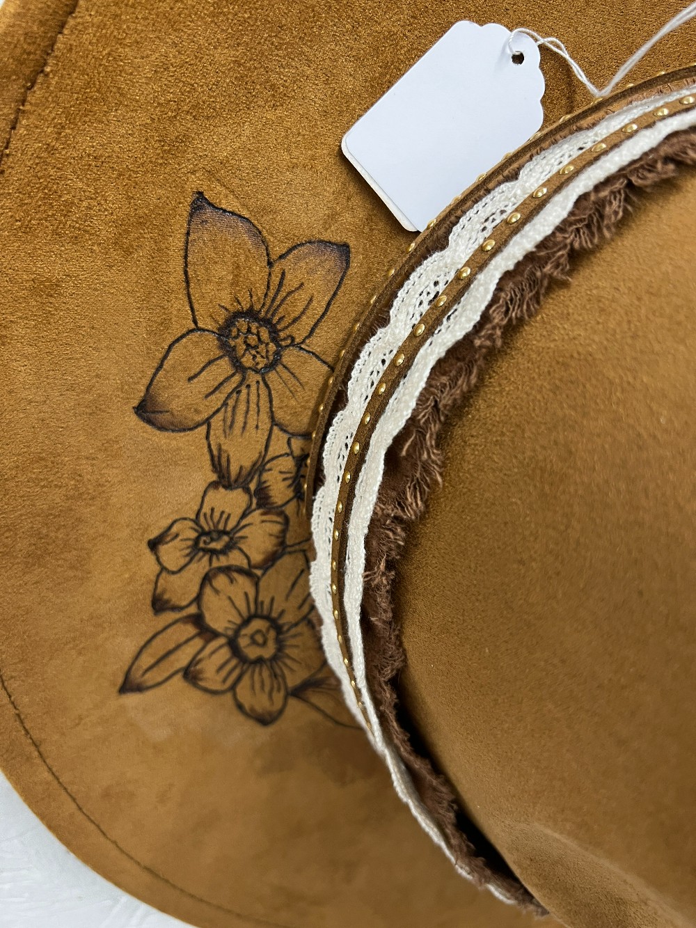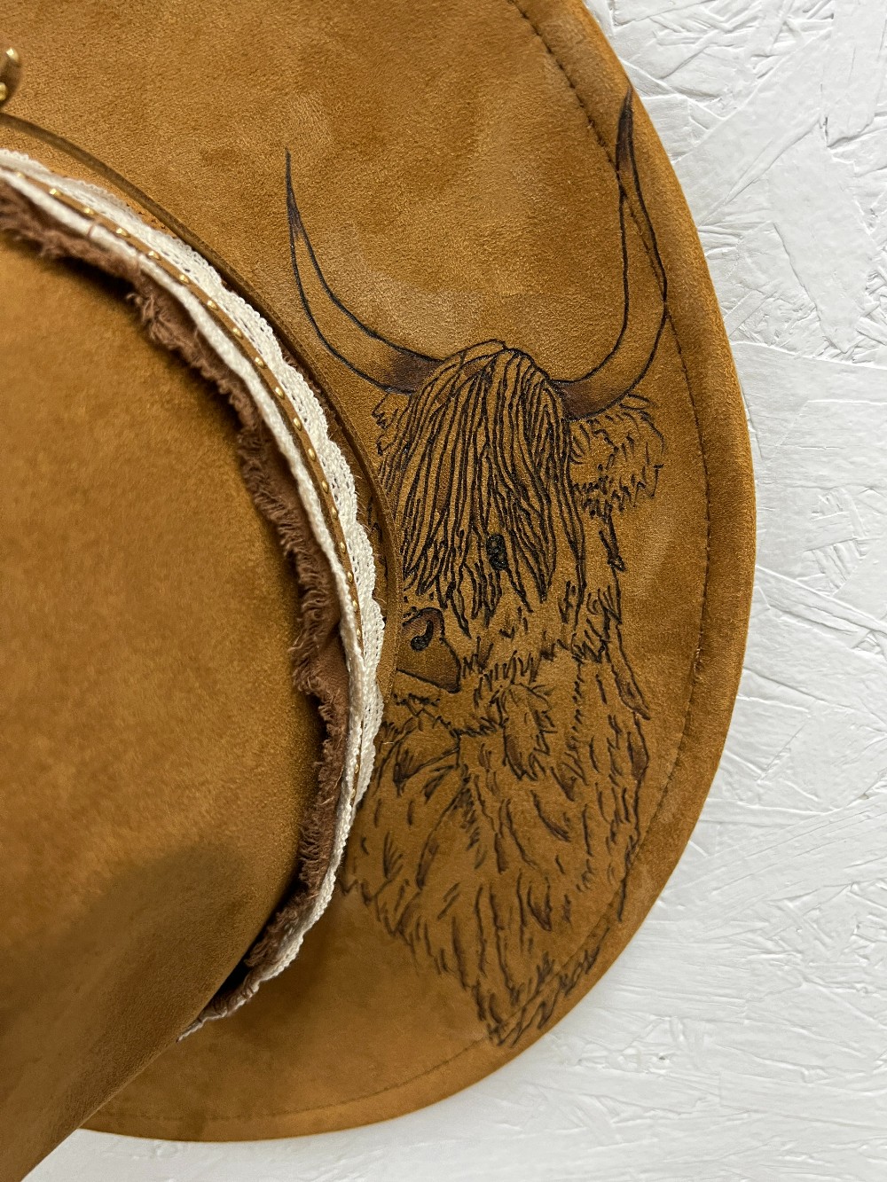Highlander and flower Design Fedora style hat. - This Hand Burned Adult Khaki color, wide brim, vegan suede hat with a hand burned Highlander and flower design. It has a cute dark brown velvet band with and overlay of lace and studded leather cord. This Hat has an overall size of 15-inch. The wide brim is 3.8 inches and the hat height is 4.7 inches. It is adjustable in size and start as a 7 3/8 and can be tightened with an adjustable pull hidden ribbon inside to a 6 3/4. Because of various sanitary concerns, hats are NOT returnable or exchangeable. ALL SALES FINAL