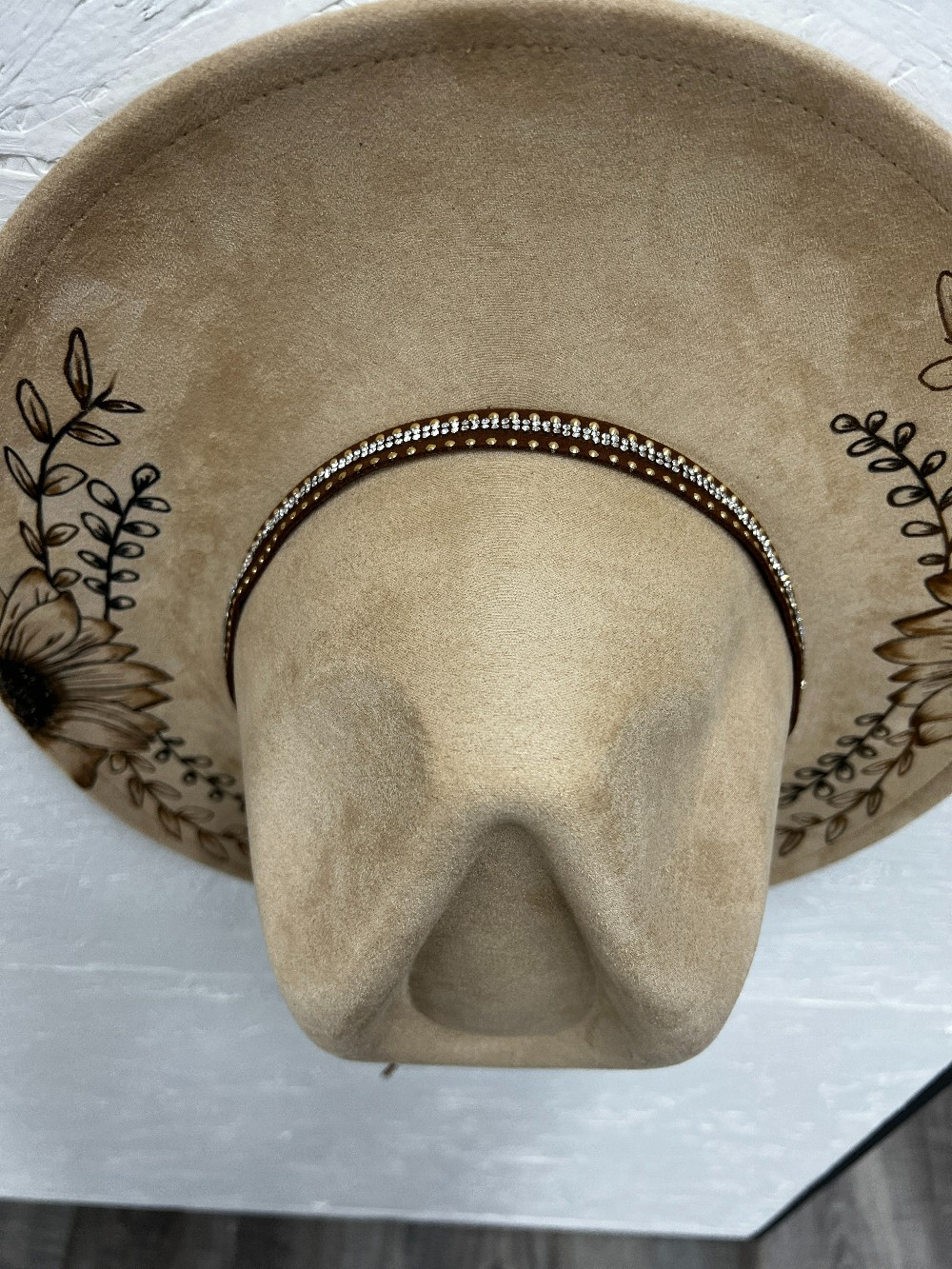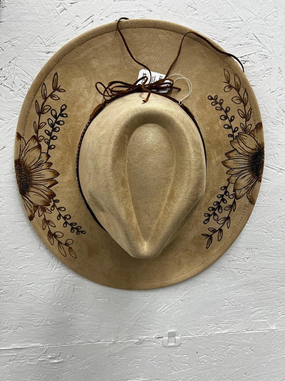 Sunflower Design Fedora style hat. - This Hand Burned Adult latte color, wide brim, vegan suede hat adorns sunflowers and leaves. It has a beautiful dark brown studded band with just a touch of bling. This Hat has an overall size of 15-inch. The wide brim is 3.8 inches and the hat height is 4.7 inches. It is adjustable in size and start as a 7 3/8 and can be tightened with an adjustable pull hidden ribbon inside to a 6 3/4. Because of various sanitary concerns, hats are NOT returnable or exchangeable. ALL SALES FINAL