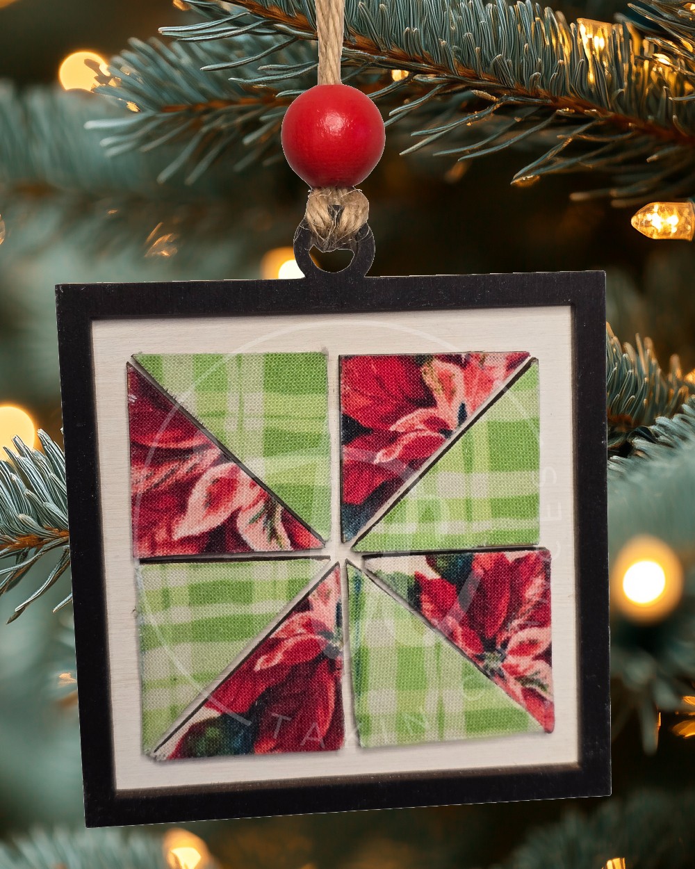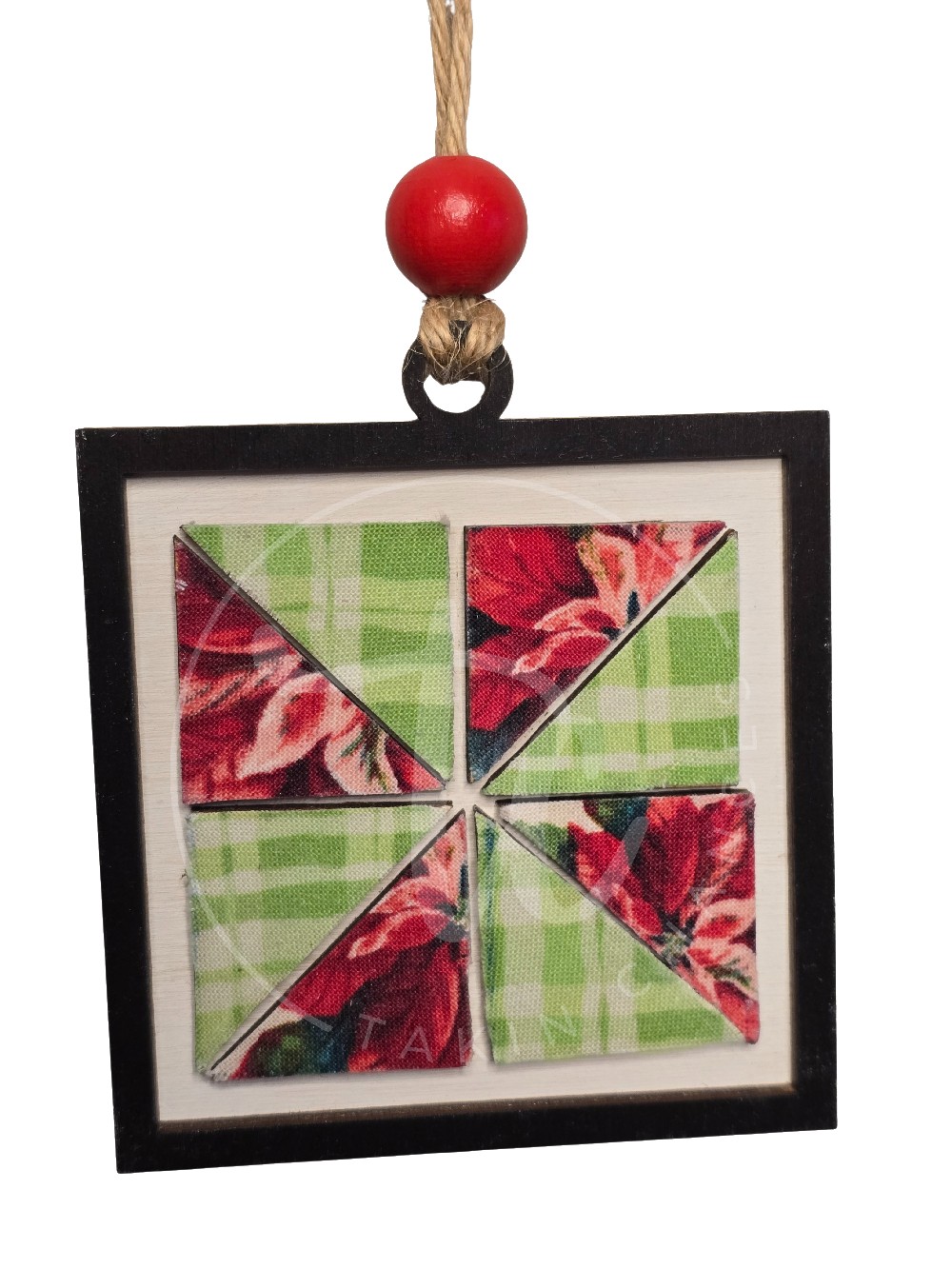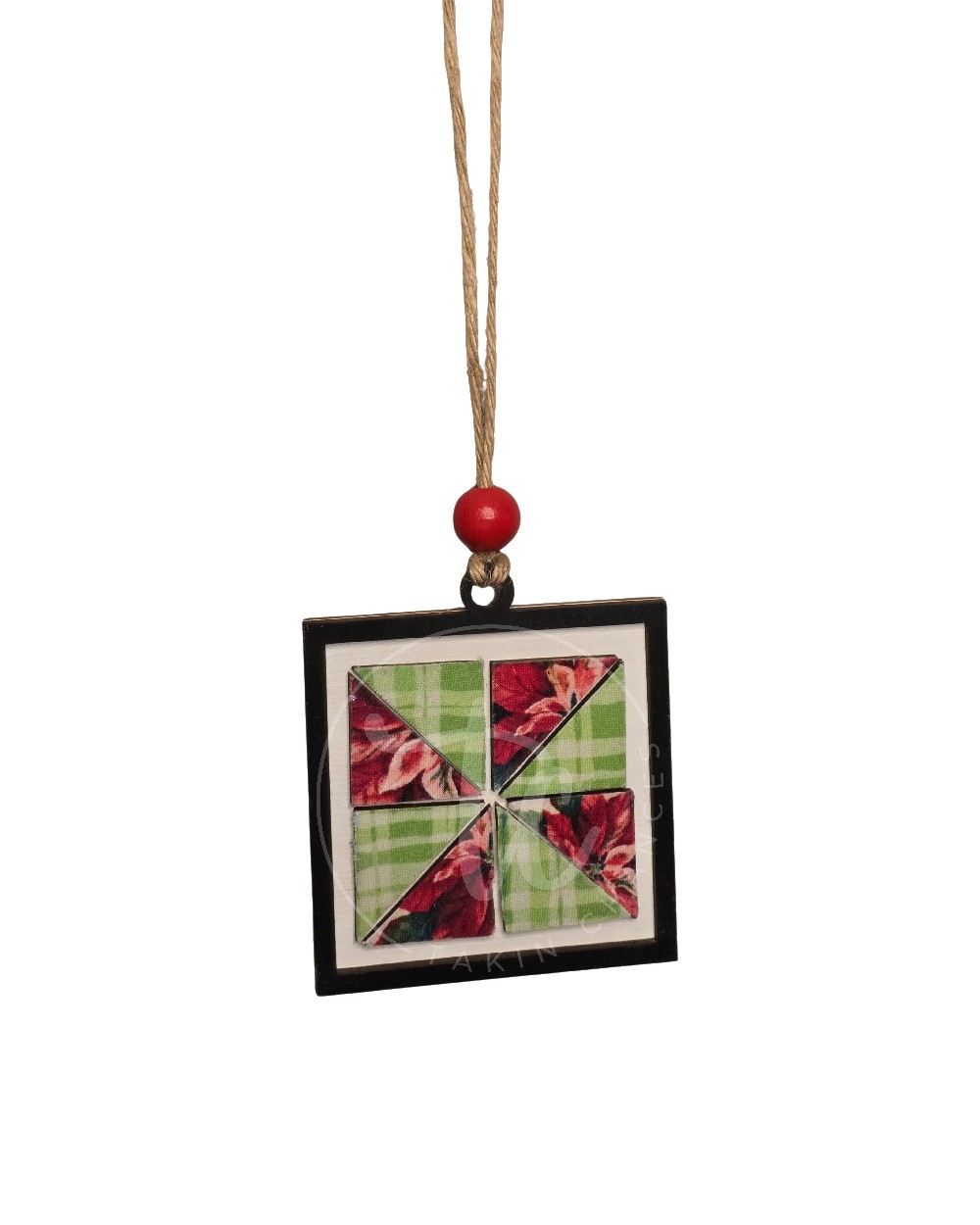This beautiful pinwheel Christmas quilt block ornament will look darling on your tree. Or give as a gift to your favorite quilter. Who wouldn’t love a little extra holiday cheer? Ornaments are cut from high-quality 1/8" Baltic Birch. They are hand-painted with acrylic paints and/or stains or covered in high quality fabrics and papers. The ornaments have multiple layers for a great 3D look. Fully handmade. The finished piece might vary slightly from the photos, but the same color scheme will be used. Also, the bows or beads on the ornament may be different from those in the photo, but they will still be a Christmas design. Ornament diameter is approx. 3" x 3"
