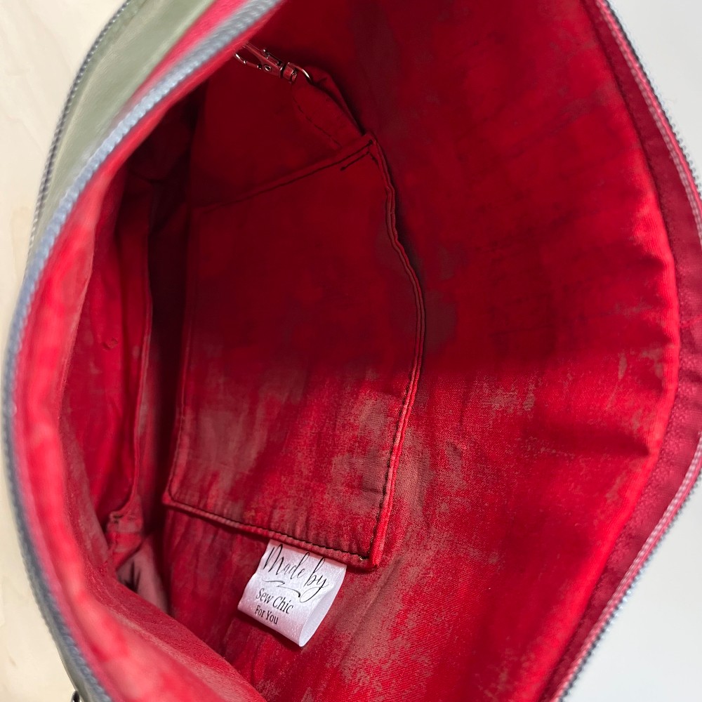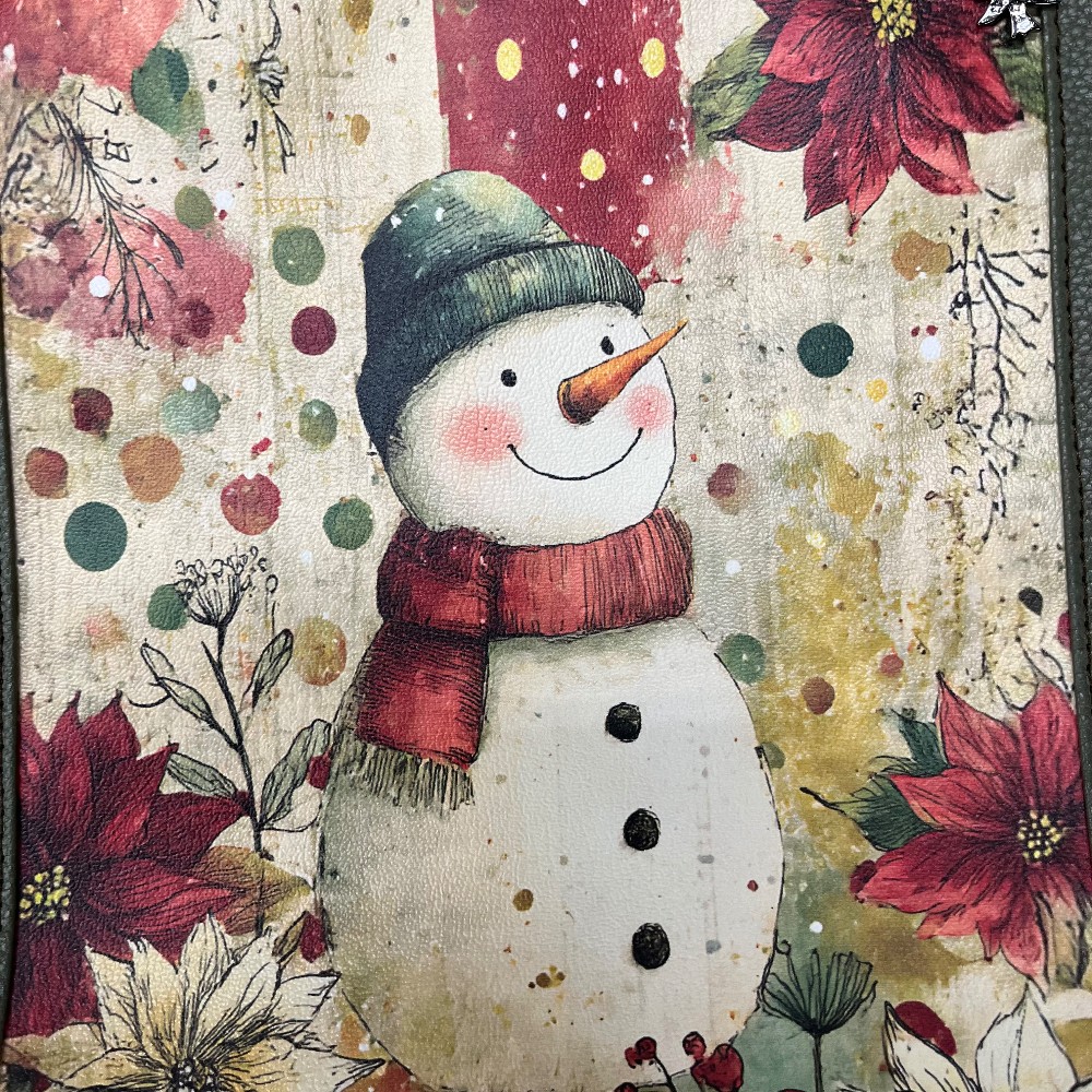 Olive green vinyl frames the Christmas Snowman panel. Handbag is lined w/red and gold grunge cotton lining, dimensions 13x11”. Outer zipper pocket, inside full width slip pockets. Matching wristlet available.