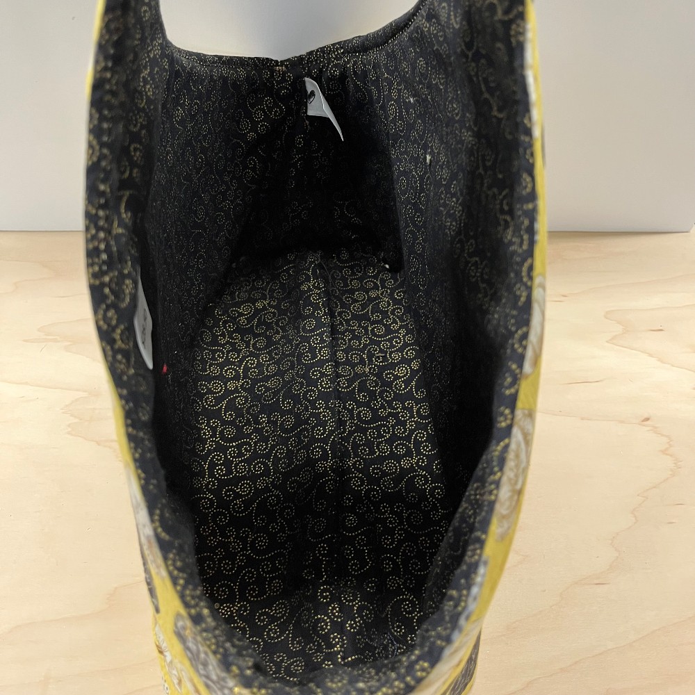 Medium handle basket, farmers market style. Quilted cotton on foam stablizer, metallic fabric lining. Storage, decoration, craft supplies.