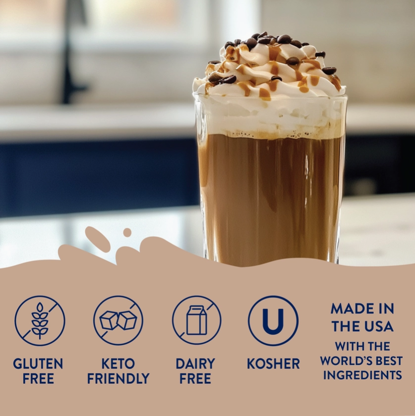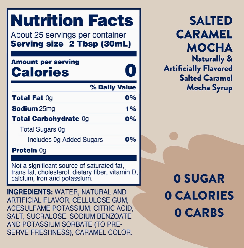The blissfully rich taste of salted caramel infused with the divine flavor of mocha. Add guilt-free flavor to coffees, lattes, tea, protein shakes, smoothies, baking, oatmeal, or just about anything. π« 0 Calories. 0 Sugar. 0 Carbs. π° 750 ml/25.4 fl. oz. Bottle - 25 Servings! β Gluten-Free & Kosher. π± Keto-Friendly. πΊπΈ Made in the USA.