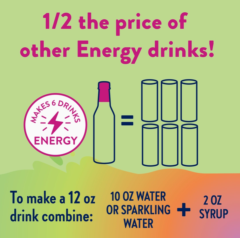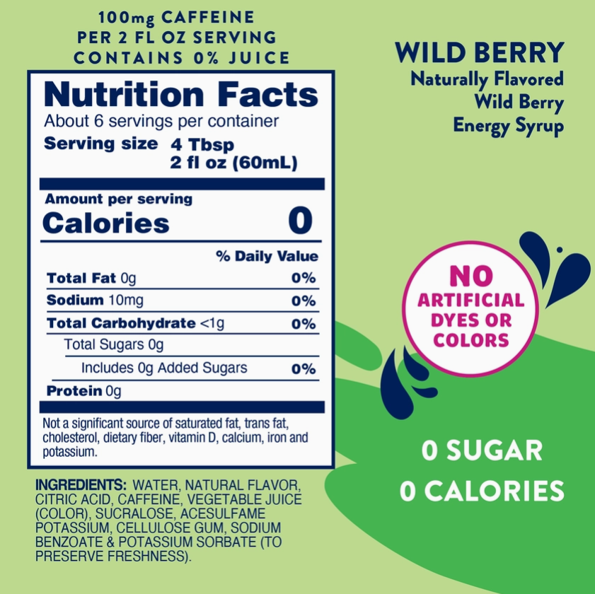 Bold berries. Big energy. Zero guilt. Sugar-free energy drink syrup with an electric blend of wild berries delivers a delicious punch of flavor and 100mg of caffeine per serving—without the sugar crash. Whether you're powering through your morning or need a 3PM pick-me-up, this 0 calorie syrup is your new go-to. 💜 Bursting with bold berry flavor—sweet, tart, and totally craveable 💜 0 sugar, 0 calories—just clean, customizable energy 💜 Replaces 6 sugary energy drinks with 6 make-at-home servings 💜 Mixes perfectly into water, sparkling water, teas, smoothies & more 💜 Gluten-free, keto-friendly, and made to fuel your vibe 🚫 0 Calories. 0 Sugar. 💰 6 Servings per Bottle ✅ Gluten-Free & Kosher 🌱 Keto-Friendly 🇺🇸 Made in the USA ✖️ No Aspartame
