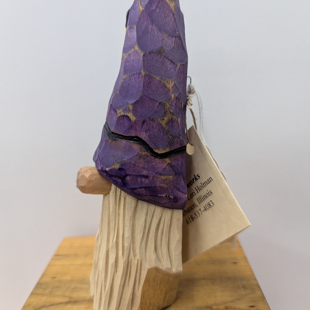 (Dimensions: 6.5" H x 1.5" W x 1.75" D) Hand-Carved Gnome with purple hat (2D). Handcrafted from wood using chisels and knives, then carefully hand-painted and finished. This piece is made from basswood. Since each piece is handmade, no two pieces are ever the same. Each has its own unique personality. This item is individually numbered and signed, making it ideal for gift-giving, or for starting your own holiday tradition that you can enjoy for many years to come. ALL SALES ARE FINAL.